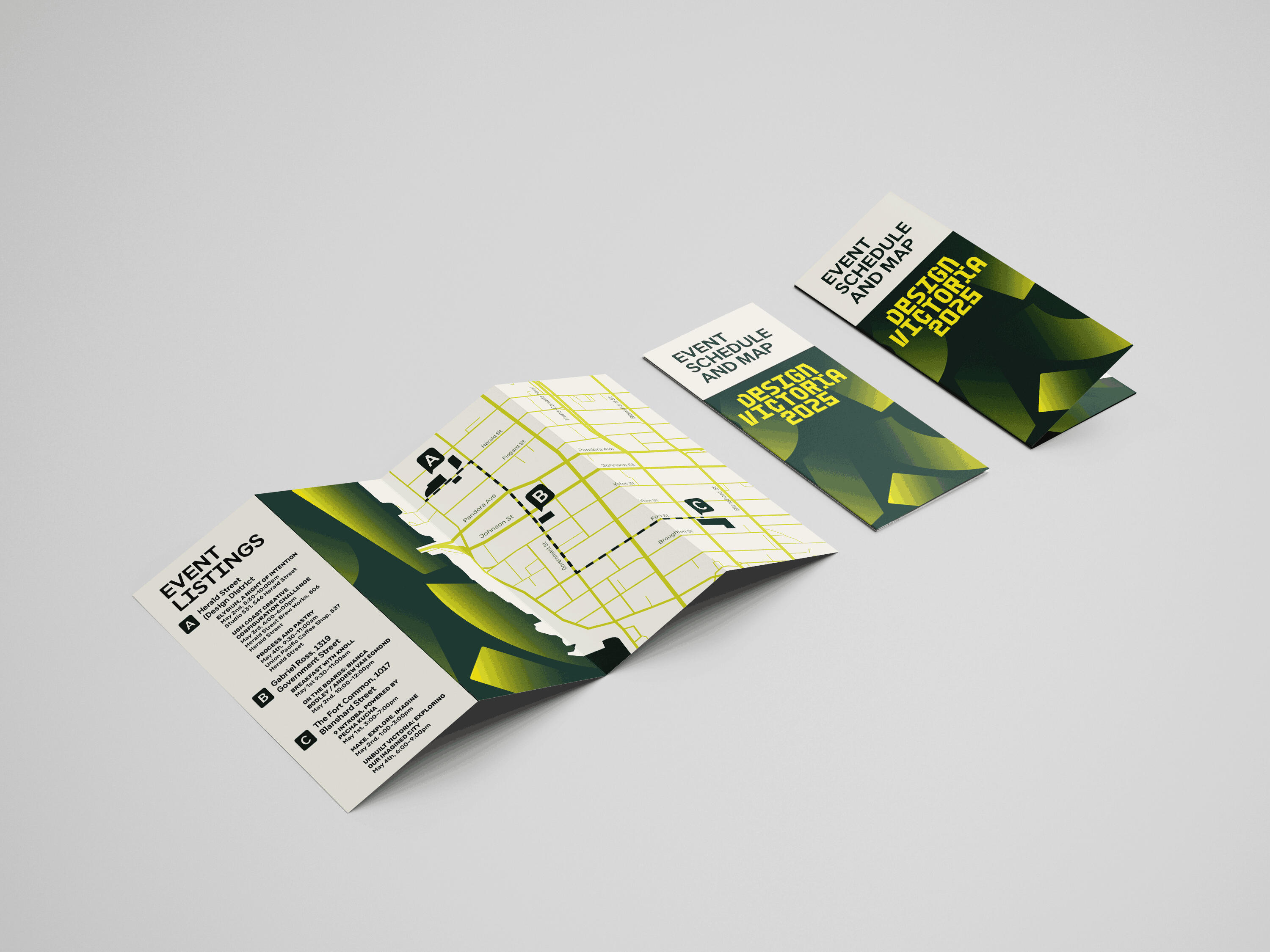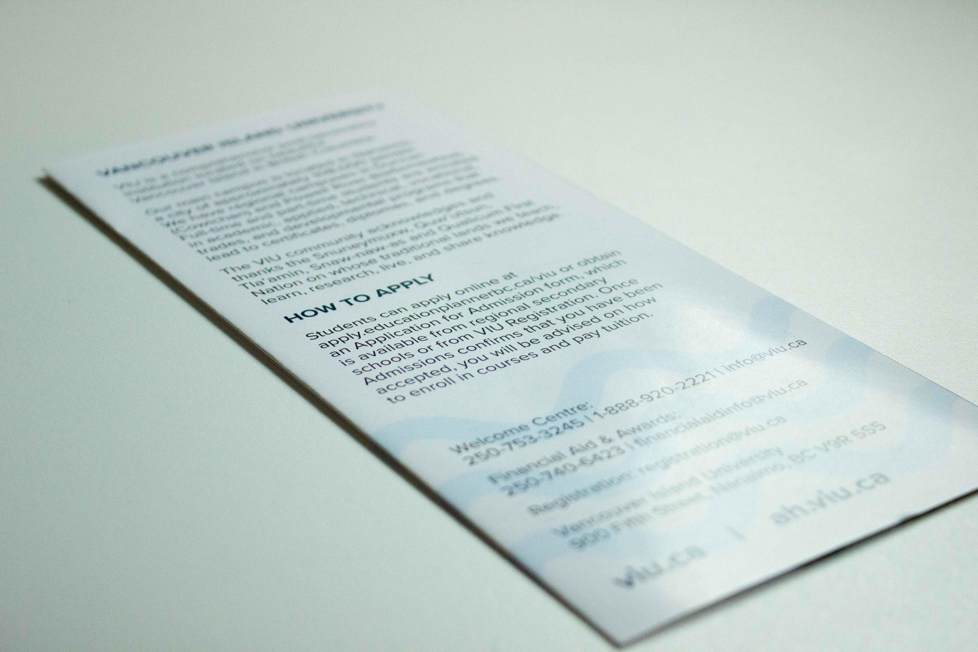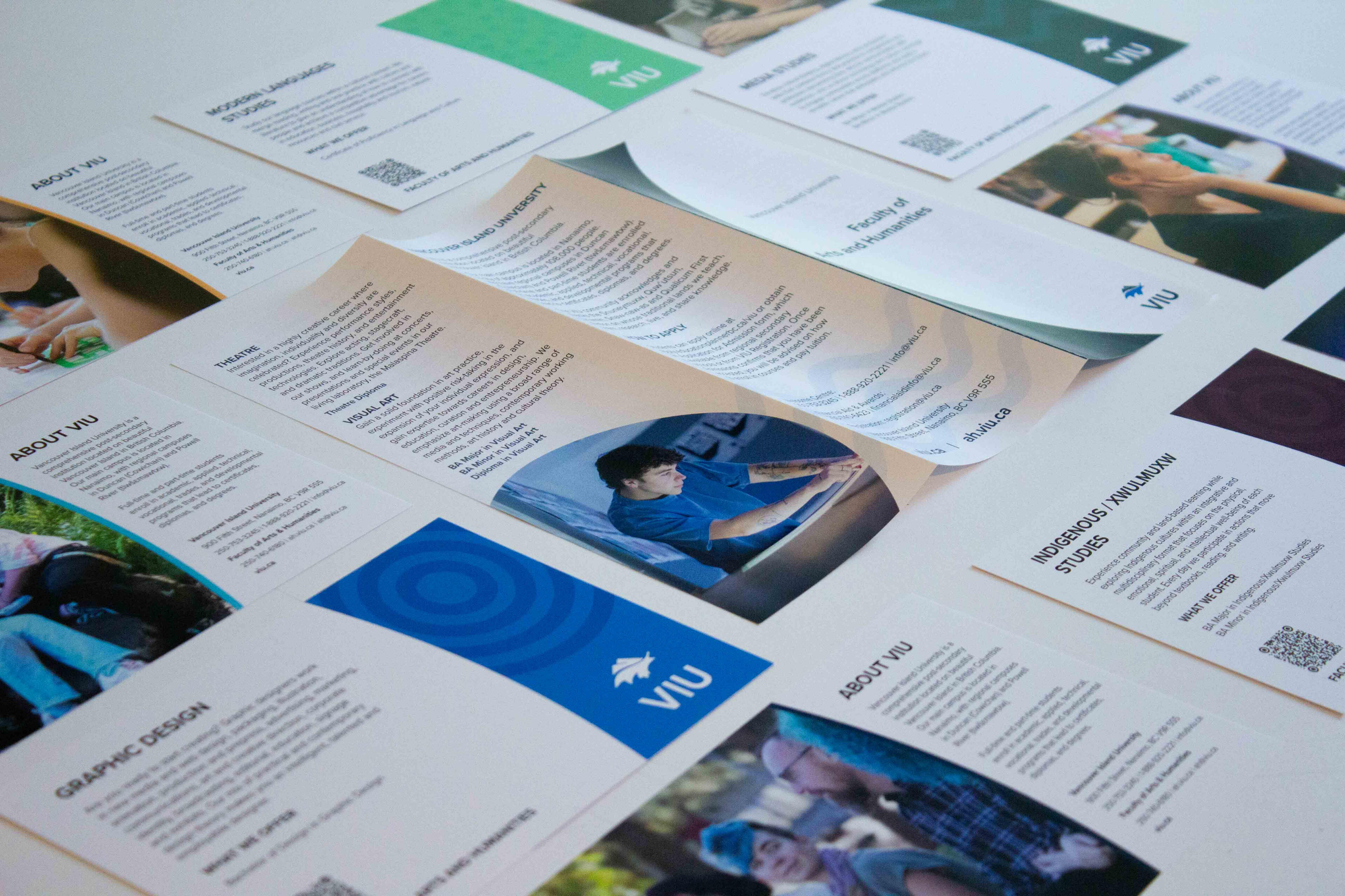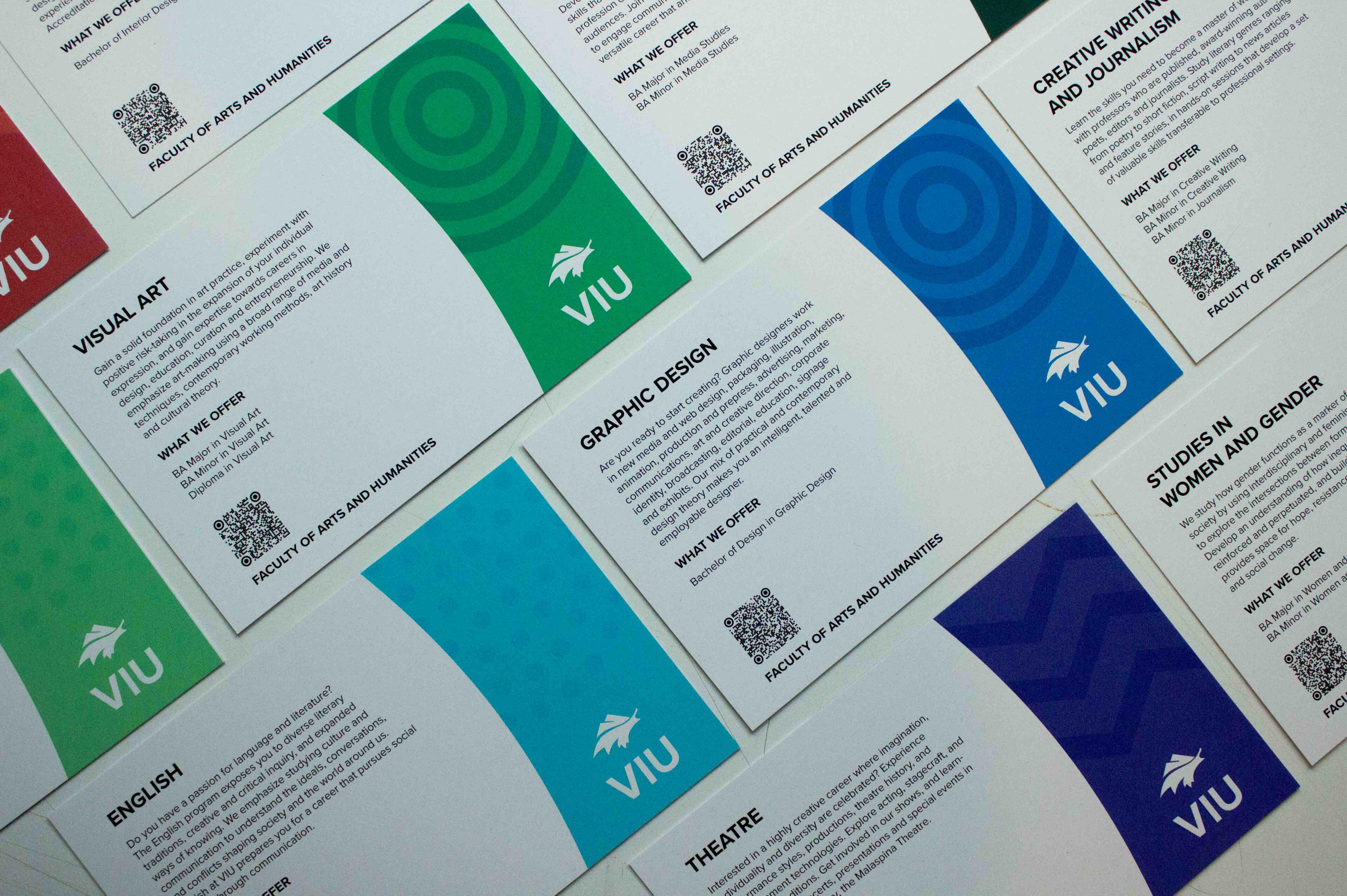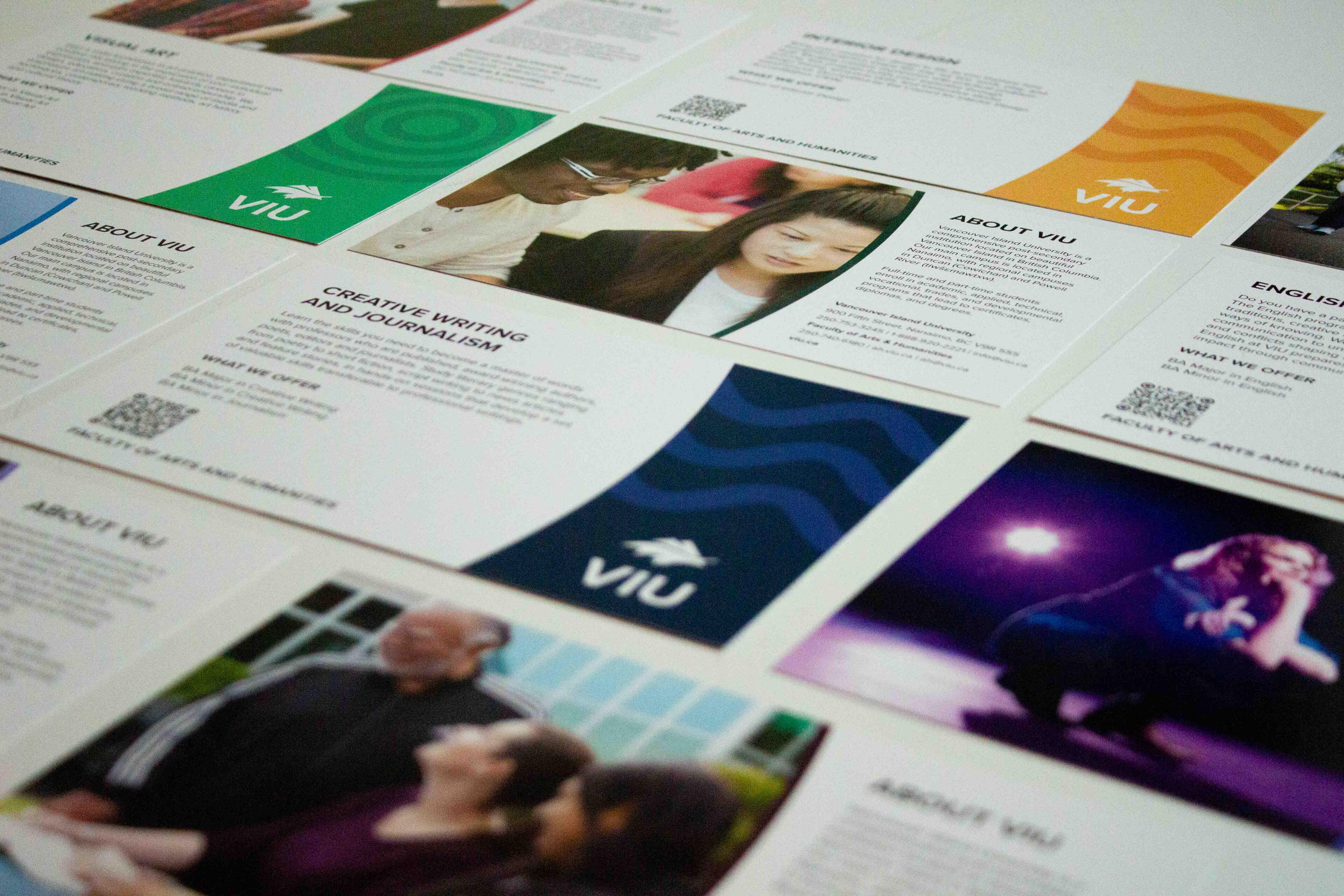 I began the process by researching the brand standards of VIU and how they would be reflected in my own designs. VIU has four main patterns that they tend to use: waves, ripples, seeds, and mountains. These would act as pillars for my early ideation alongside each department's colour palettes. For the finalization of the completed projects, I helped the client communicate with the print shop to ensure proper specifications were met for an easy print job!