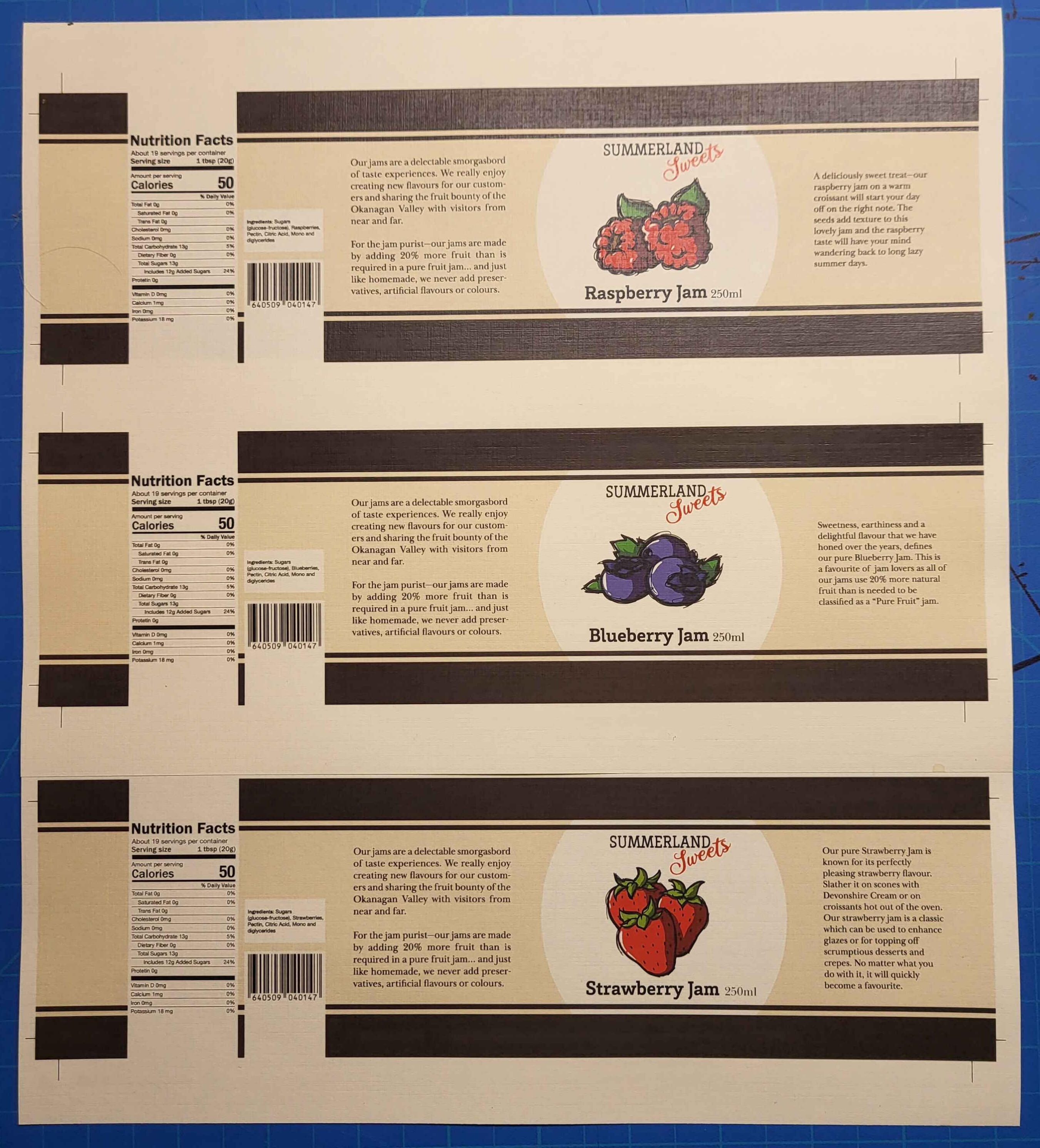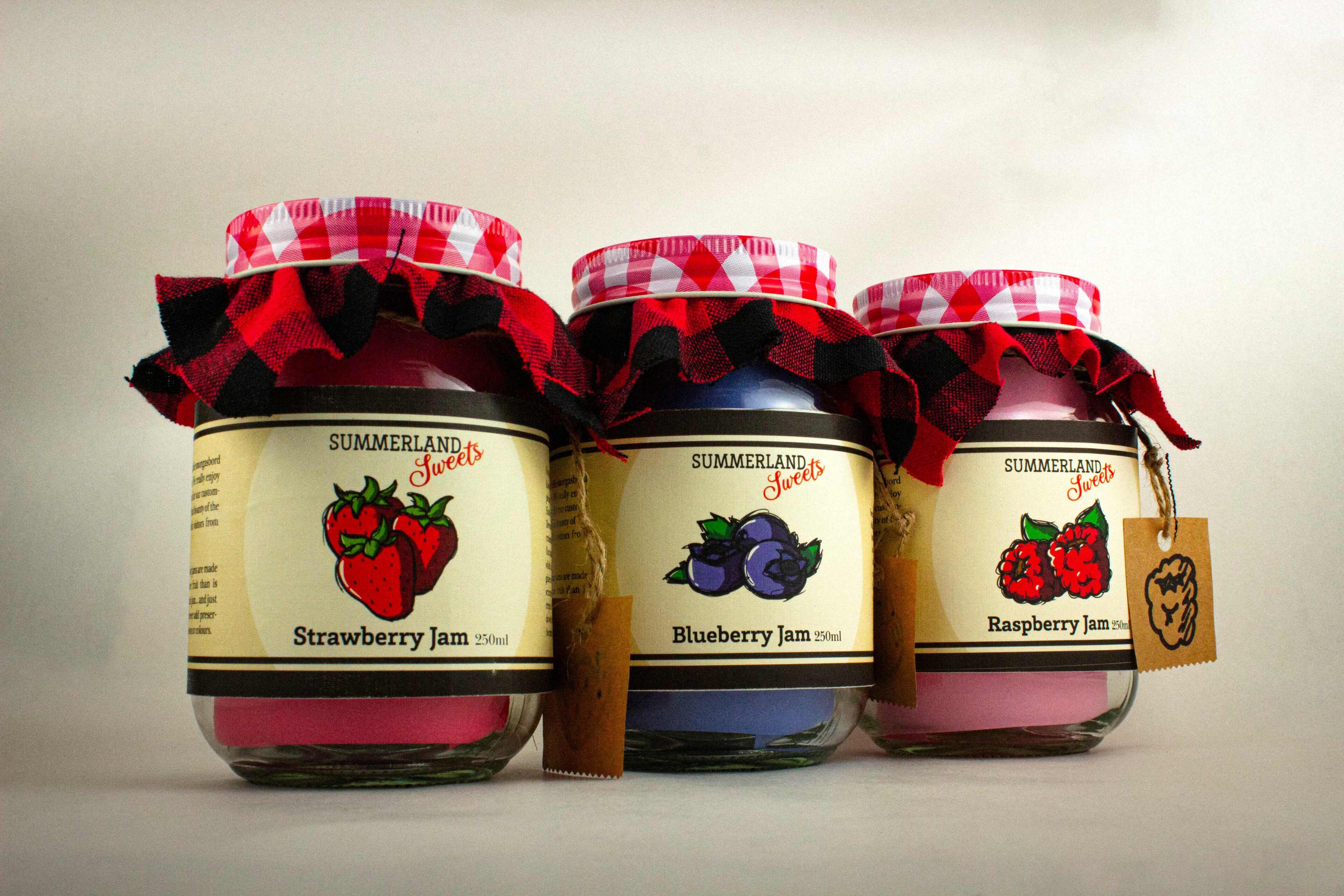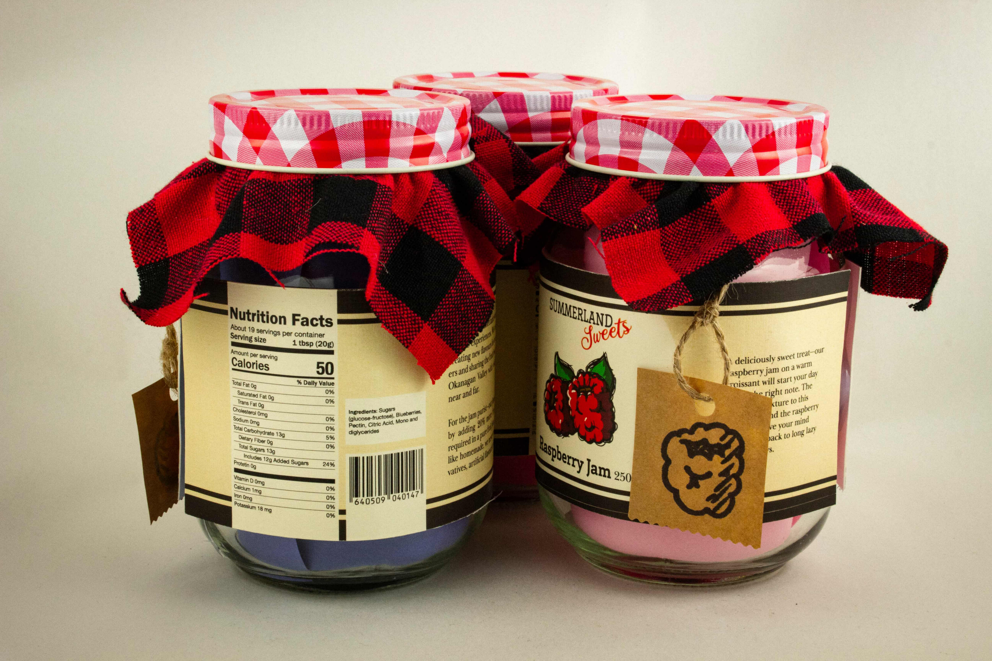 Because Summerland Sweets prides themselves on their heritage and community, this design needed to focus on locality and having that home-made feeling. These jars were cut, glued, and put together by hand to reinforce the handmade aspect of the product. This approach helped solidify the jars as hand-illustrations support the local brand while the rest of the design tips towards professionalism and refinement of the craft, much like the team at Summerland Sweets!