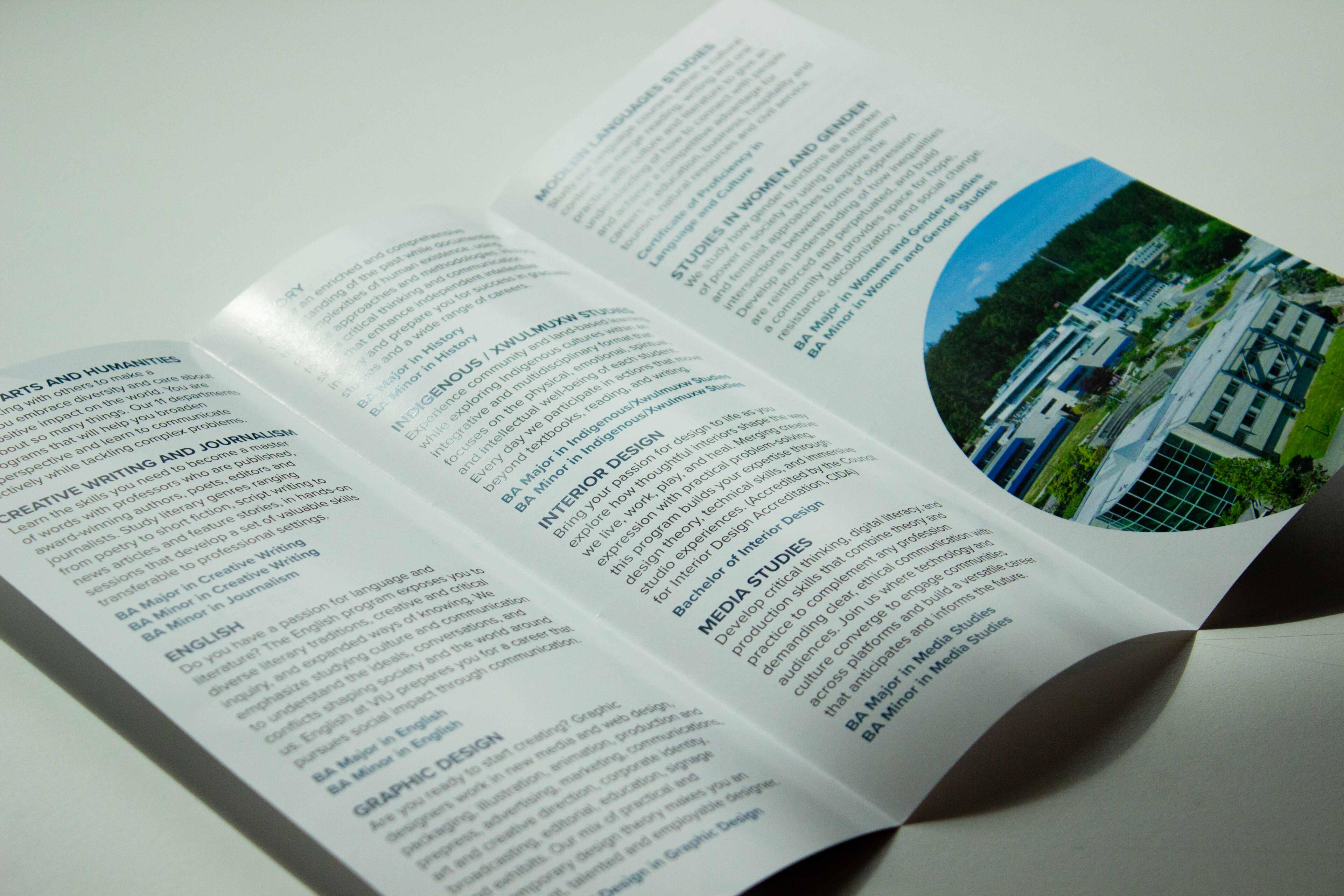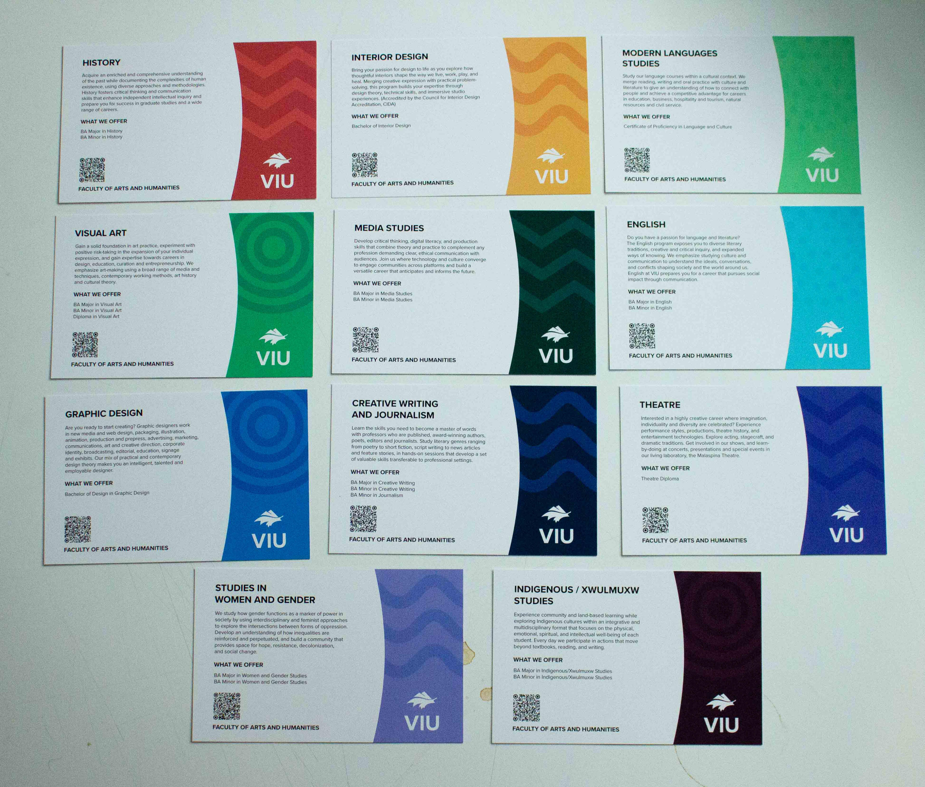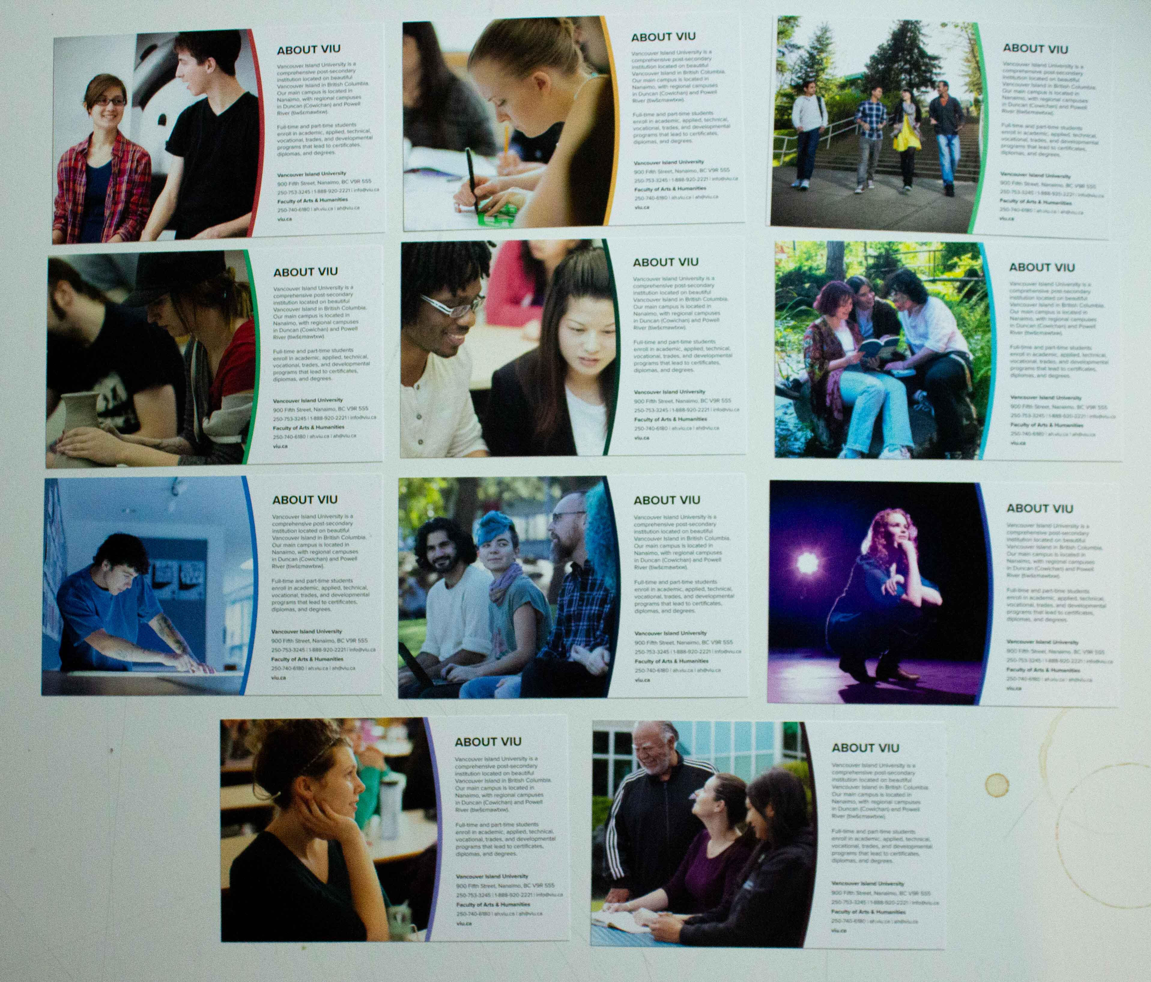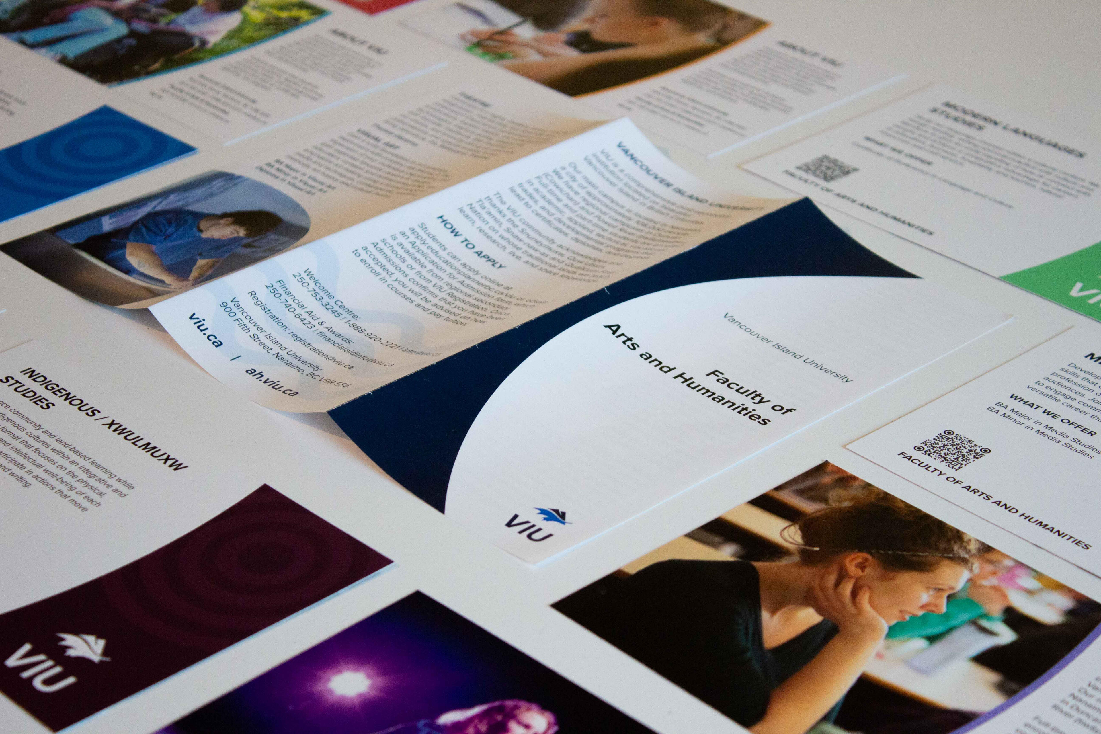 The goal of this project was to create advertising material for VIUs Faculty of Arts & Humanities. With a change in offered programs and courses along with outdated written statements from the chairs of each department, the advertising for the Faculty of Arts & Humanities needed a fresh look and some cleaner representation.