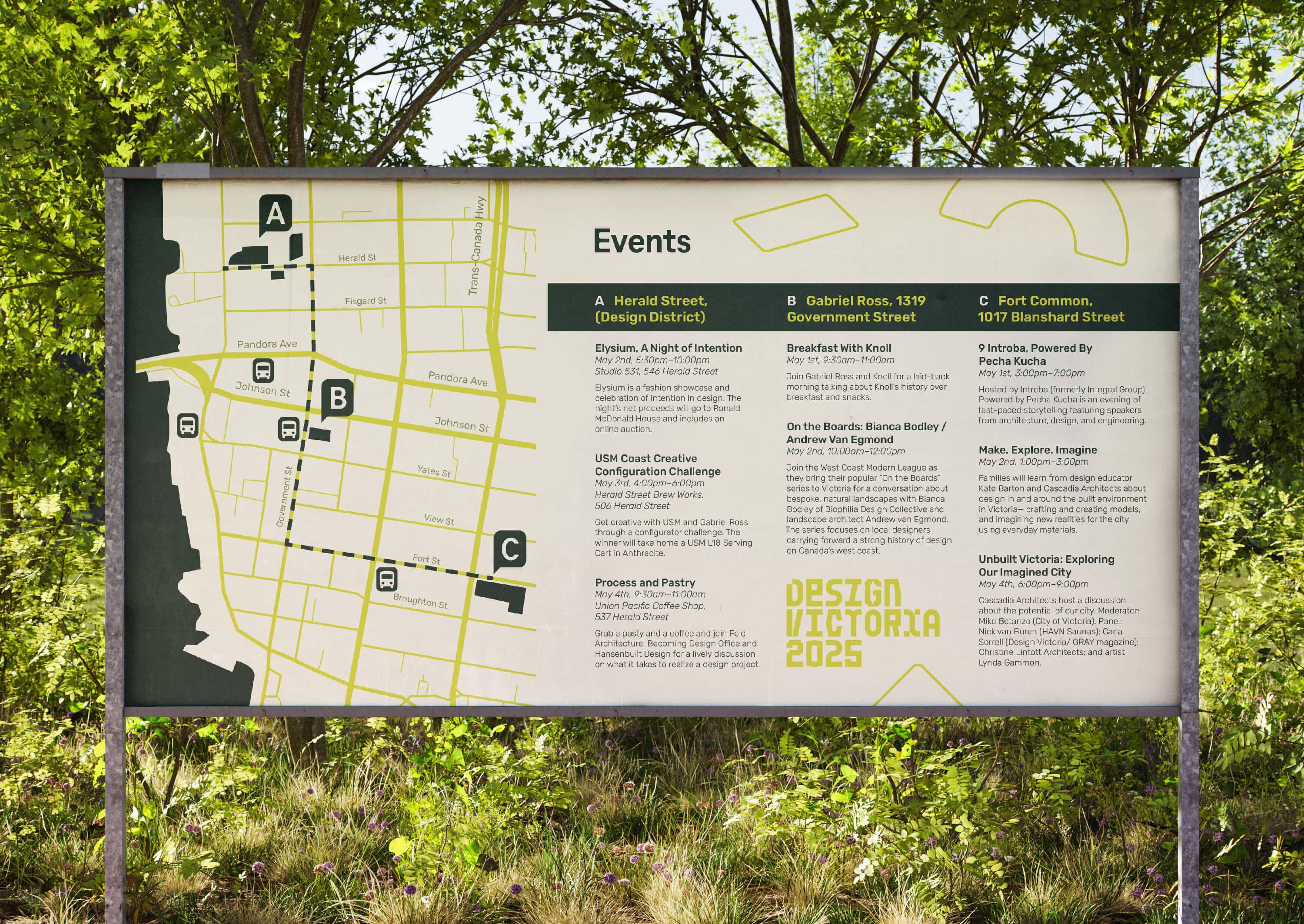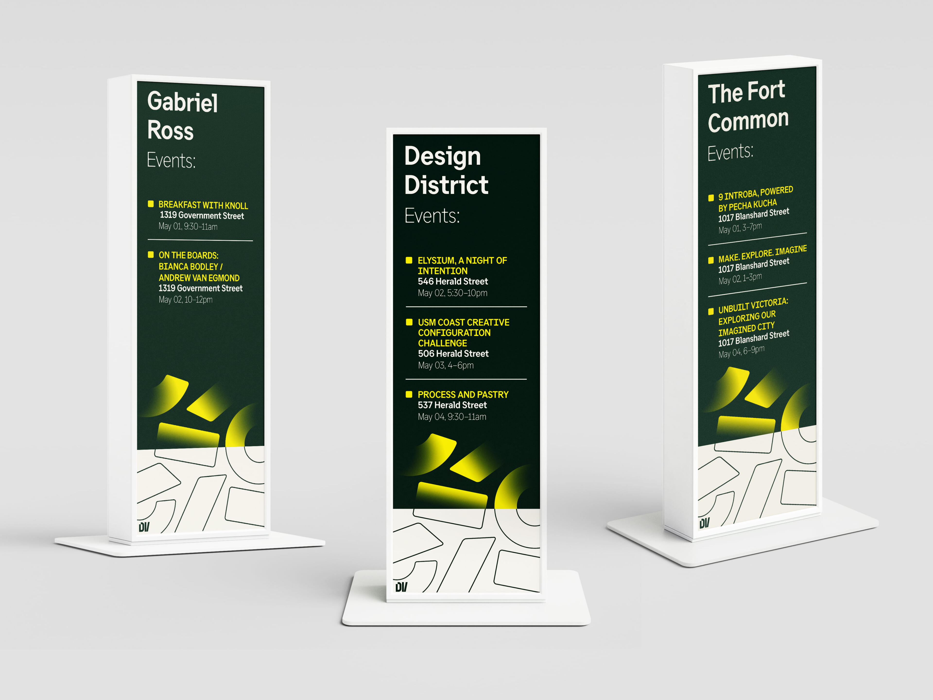 This project stands out to me as a critical piece of learning how to collaborate with other designers. For this project, myself and two other designers, Eldin and José Padilla (find their portfolio links at the bottom of the page!), were tasked with designing conceptual layouts for various forms of branding for a Design Victoria event using premade assets by Joe Thoong.