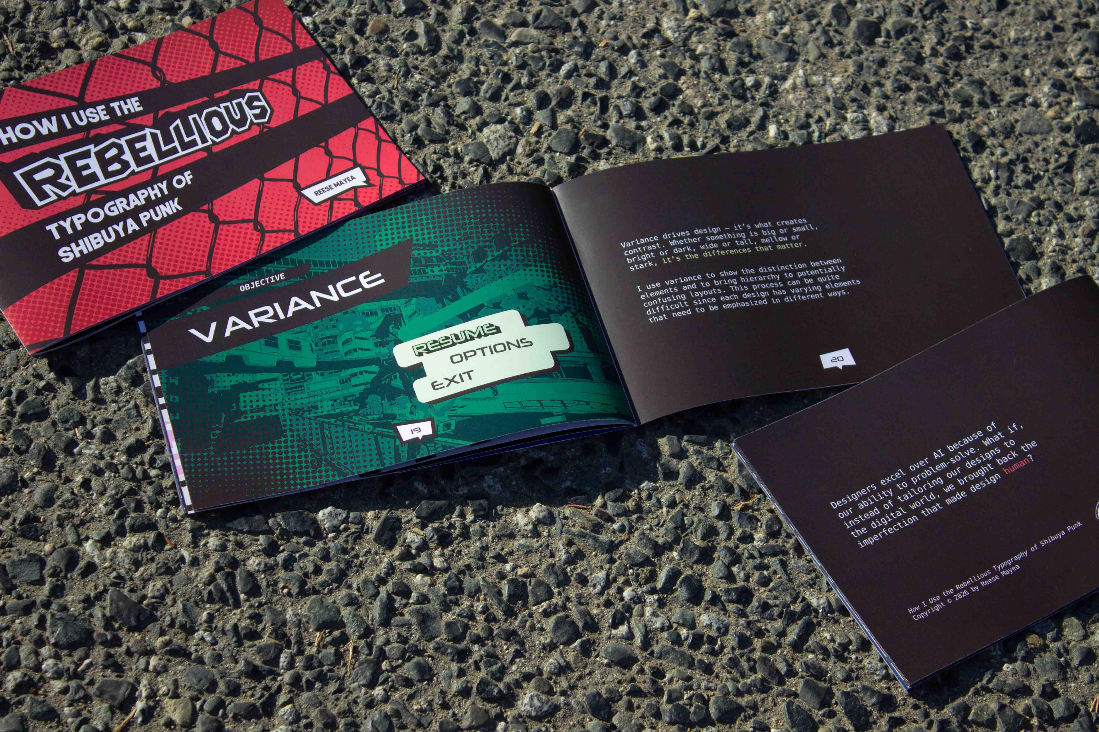 The goal of this project was to create a booklet showcasing a selection of type principles that were important to me as a designer. This booklet was supposed to reflect the tone and aesthetic of my brand. Personality plays a large part in this project so my research was, effectively, figuring out which aspect of my personality or aesthetic I needed to prioritize to showcase the type principles I value most. This is where I decided the best approach was an identity tied to the urban aesthetic of Shibuya Punk: a visual style embodying individualism with an exaggeration of personalization.