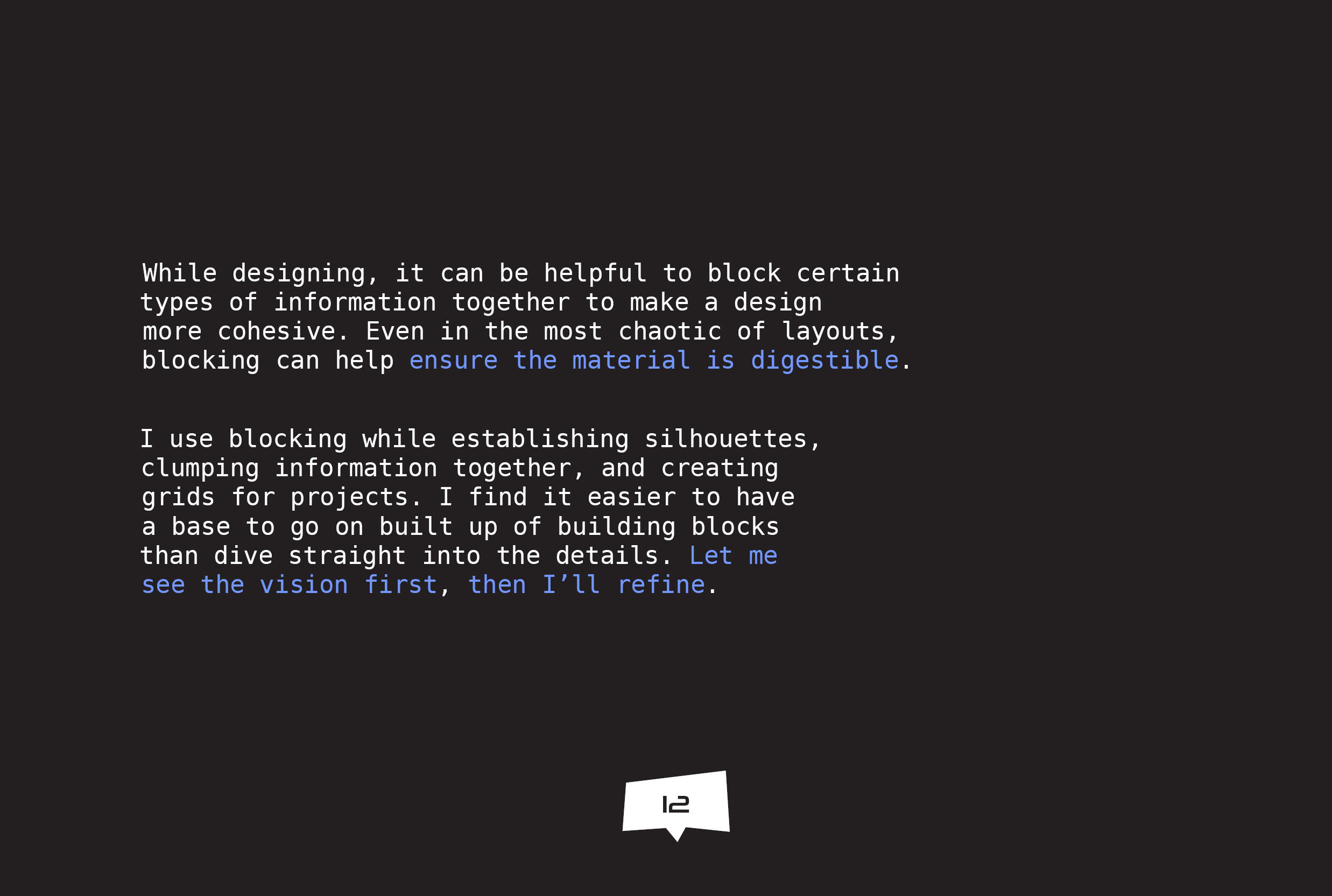 We chose to focus on collaboration and communication by creating a group Discord chat for the three of us to exchange inspirations and critique. We would consistently share our progress to keep each other updated while scheduling time to meet in person to discuss the direction of the project in further detail. This ended up contributing massively to how cohesive the project looked in the end.